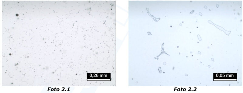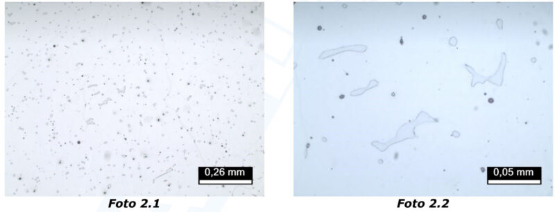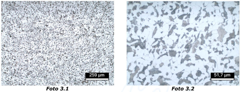 As fotomicrografias mostram a microestrutura da amostra, revelando a matriz típica de um aço carbono fundido