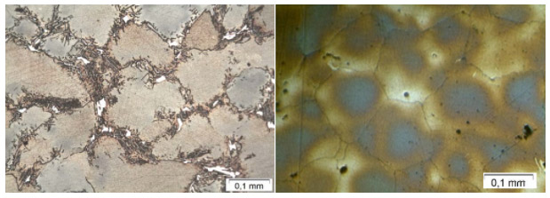 As fotomicrografias mostram a microestrutura da amostra, revelando a matriz típica de um aço inoxidável austenítico fundido, constituída por austenita e ferrita delta. Foi observada a presença de, aparentemente, fase sigma. Ataque Água Régia. Ampliação 100X e 500X.